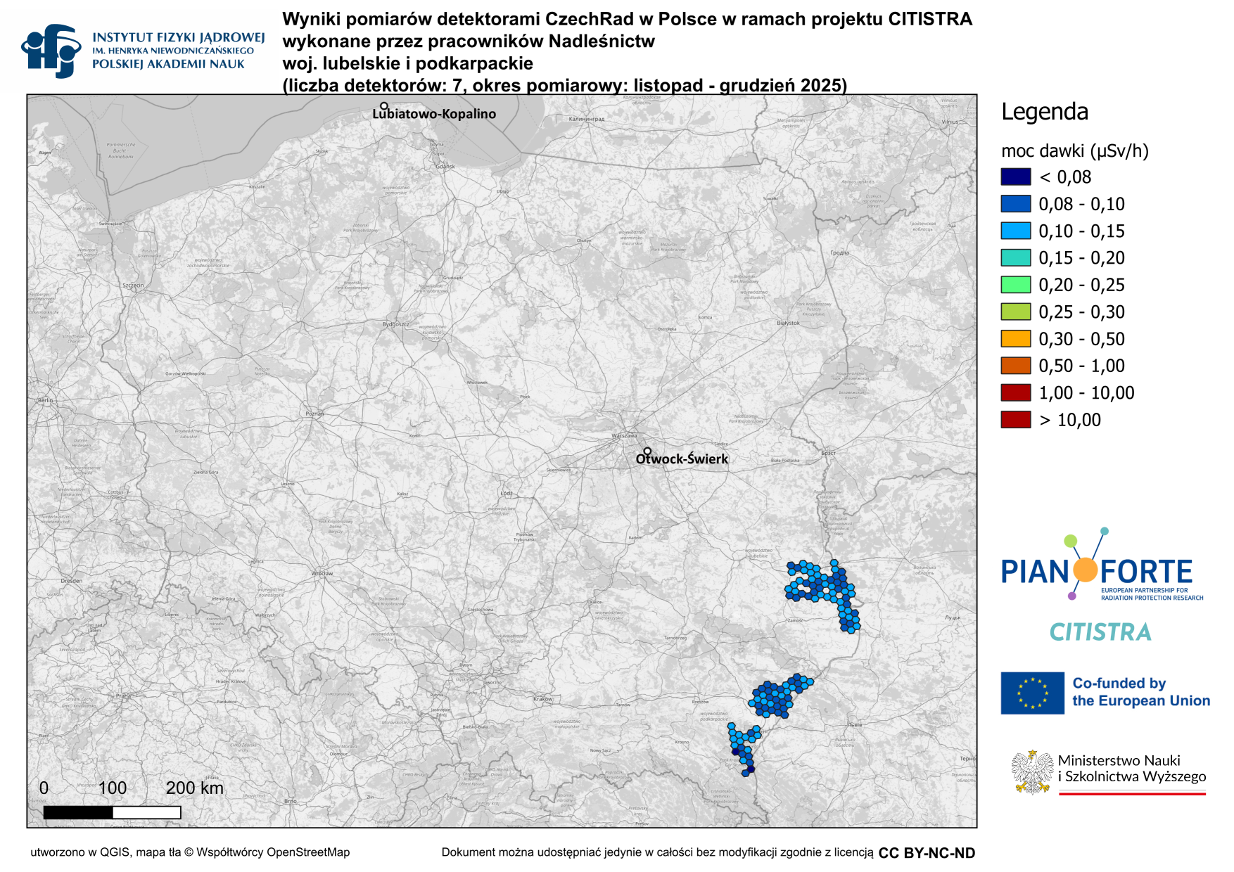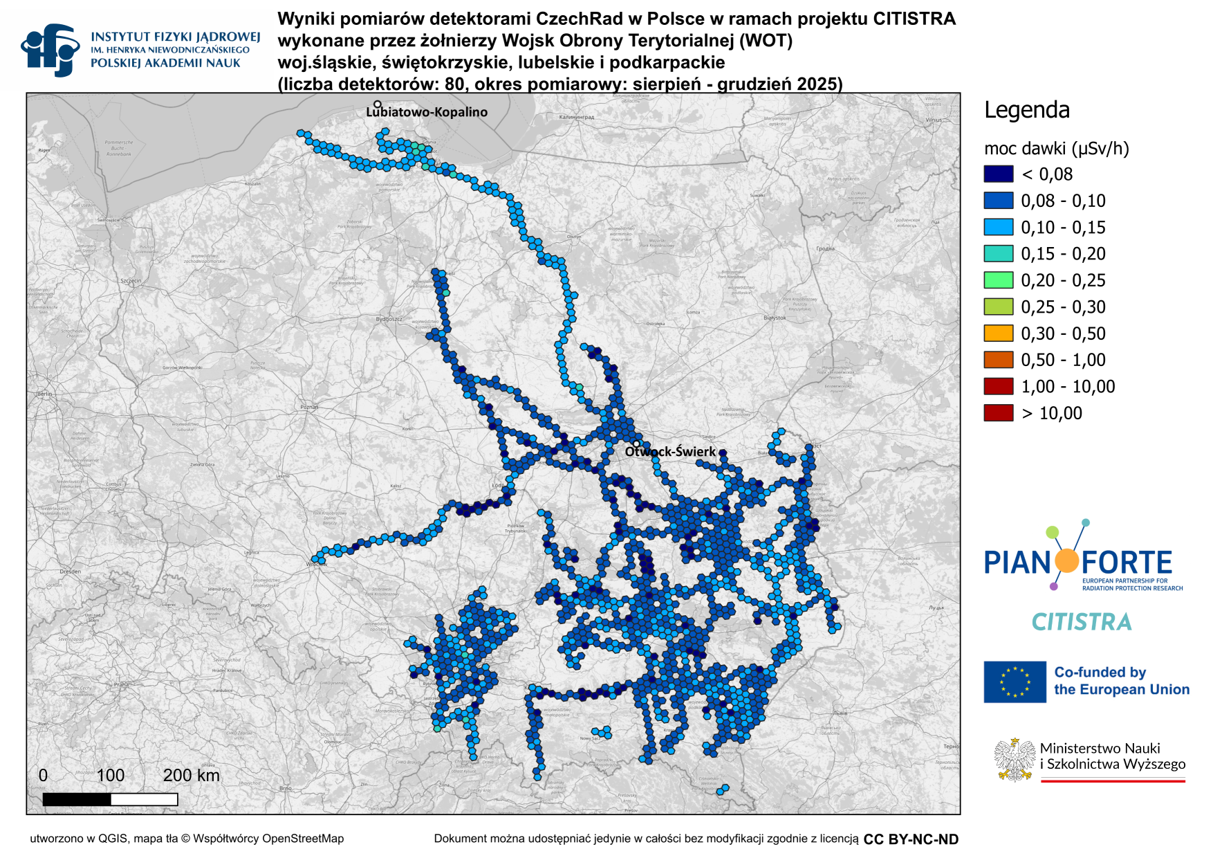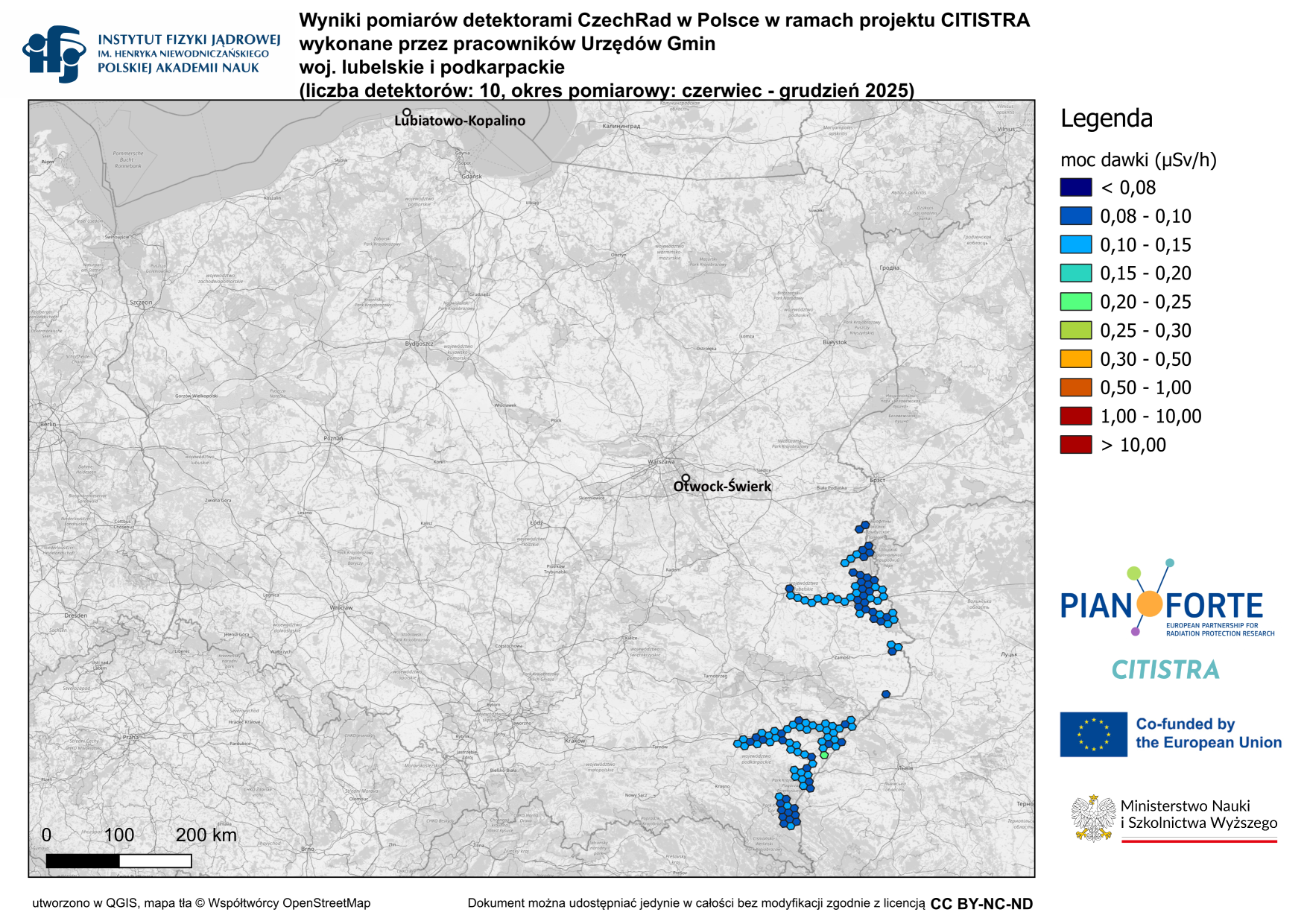 Wyniki pomiarów mocy dawki promieniowania jonizującego w środowisku wykonanych za pomocą detektorów CzechRad w ramach projektu CITISTRA z uwzględnieniem grup zawodowych użytkowników detektorów.